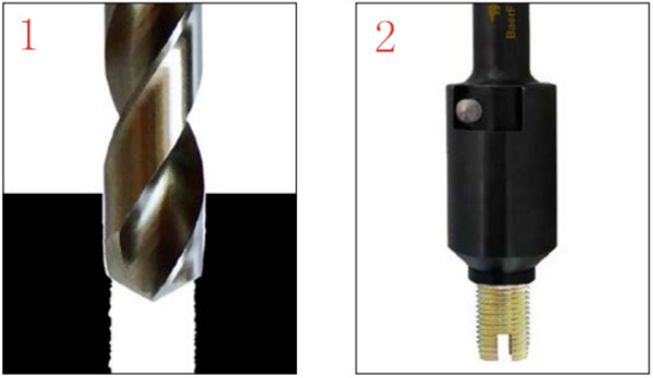 當(dāng)安裝數(shù)量較多時(shí),可采用專用的機(jī)械工具。首先把自攻螺套安裝到專用工具上,再將裝好自攻螺套的工具旋入預(yù)置孔內(nèi)1圈左右,在確保工具與預(yù)制孔端面垂直后再緩緩將自攻螺套旋入,當(dāng)自攻螺套端面低于預(yù)制孔端面0.2mm左右時(shí),停止旋入并反向?qū)S霉ぞ咝?。自攻螺套安裝工具尾端有一六角頭,可手動(dòng)也可接電動(dòng)或氣動(dòng)工具。具體操作見下圖。