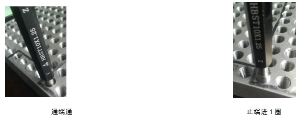 使用鋼絲螺套專用螺紋塞規(guī)(俗稱:底孔塞規(guī)),對(duì)攻絲完成的安裝鋼絲螺套用內(nèi)螺紋進(jìn)行檢測(cè)。通端通,止端最多進(jìn)2圈,表示底孔合格。